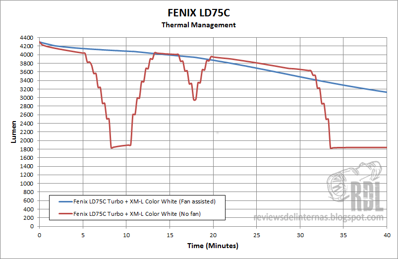 El control térmico monitoriza la temperatura de la linterna reduciendo el rendimiento de los cuatro XM-L2. Para ilustrar el comportamiento, he superpuesto los primeros 40 minutos del anterior test (realizado con ayuda de un pequeño ventilador, línea azul) con los datos obtenidos tras repetir el test, esta vez sin refrigeración activa (línea roja), por lo que podemos observar como la linterna realiza dos altibajos en su salida, en los que gracias a reducir la corriente a los emisores LED ha conseguido bajar la temperatura y, una vez estabilizada, retomar la salida previa. También podemos ver como dichos altibajos, stepdowns térmicos, se realizan de manera progresiva, ligeramente escalonados a lo largo de varios minutos.