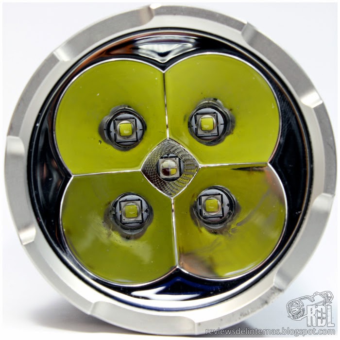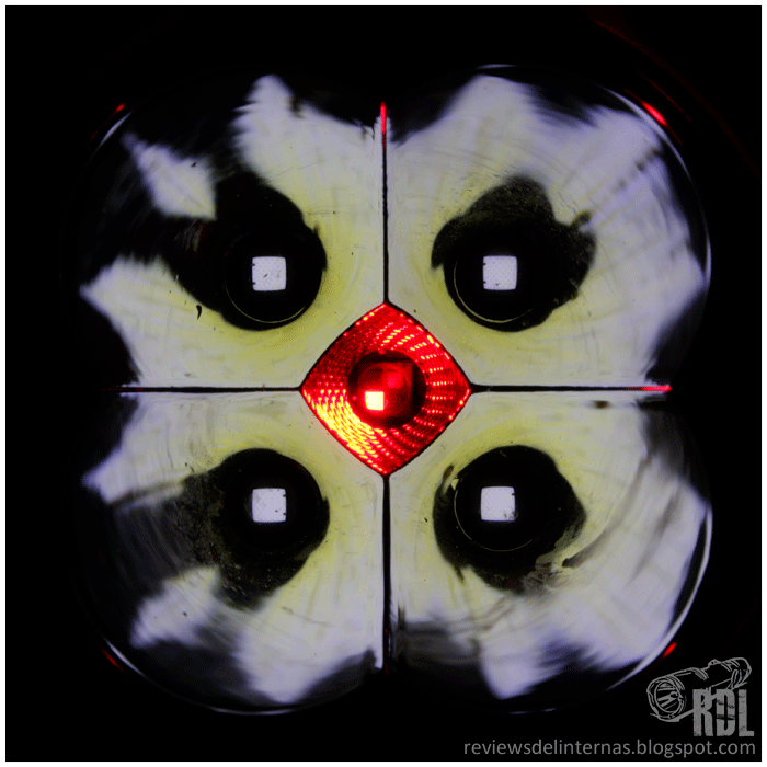 La óptica de la linterna es sin lugar a dudas el punto más reseñable de su diseño, ya que tras la lente de cristal con tratamiento AR encontramos un curioso reflector quíntuple, en el que los cuatro XM-L2 gozan de una superficie de reflexión lisa, mientras que el XM-L Color, situado en el punto central, tiene un acabado rugoso. El centrado en todos y cada uno de los cinco emisores es aceptable.
