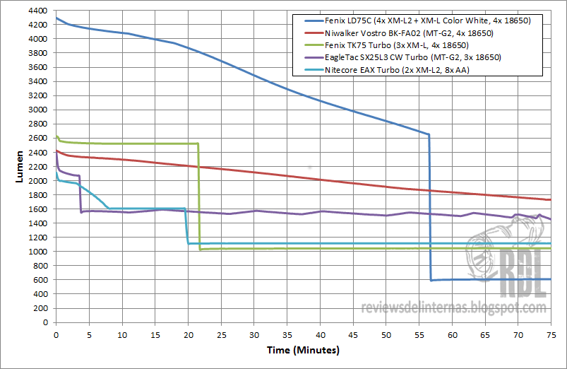 Para el test de runtime he utilizado un pequeño ventilador de 60mm para mantener la linterna refrigerada, por lo que el dibujo de la línea es más o menos plano.