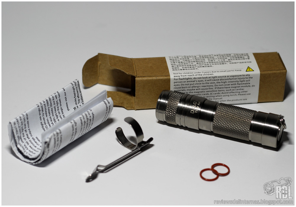 En el interior de la caja encontramos la linterna, un par de o-rings de recambio, un clip y un manual de instrucciones en chine e inglés.