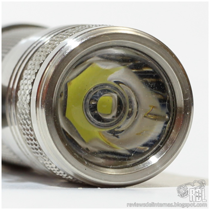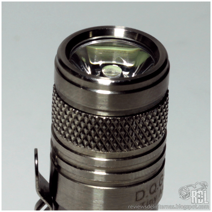 La óptica de la linterna cuenta con una lente TIR, con el emisor LED correctamente centrado. En el interior de la lente encontraremos, muy bien disimulada, una junta luminiscente que brillará con fuerza al apagar la linterna, como ya vimos en otras DQGs.