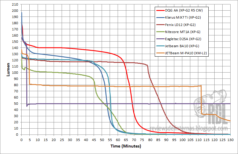 Comparada con otras linternas similares, la DQG muestra una excelente curva, aunque con un runtime limitado dada la relativamente alta salida que posee y la ausencia de un stepdown.