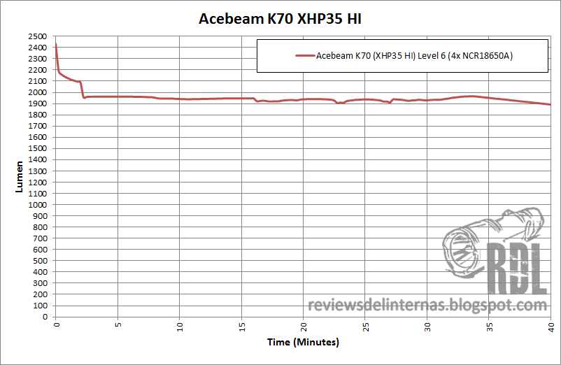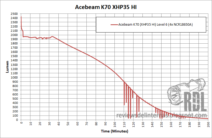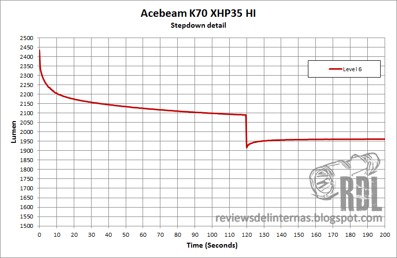 La regulación del modo de máxima salida, nivel 6, es de tipo híbrida. Tenemos un pequeño e inapreciable stepdown que entra en acción a los dos minutos de uso continuado, para pasar a una segunda fase de regulación más o menos plana en torno a los 2000lm por alrededor de 40 minutos, momento en el cual la linterna parece pasar a una tercera fase de regulación, esta vez de tipo direct drive en la que la salida va gradualmente realizando un declive. Podemos observar como a partir del minuto 110 tenemos unas extrañas caídas en la línea: Son los avisos de bajo voltaje emitidos por la linterna en forma de parpadeos, que han sido capturados aleatoriamente por la frecuencia de muestreo de la esfera integradora.