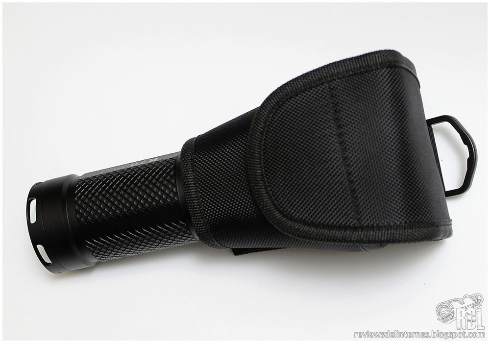 La funda es bastante básica, pero efectiva. El lugar de alojar completamente la linterna, solo abarca la parte más voluminosa de esta, protegiendo las zonas críticas como la lente o el anillo de control magnético, pero manteniendo un acceso rápido al pulsador trasero y facilitando mucho su extracción.