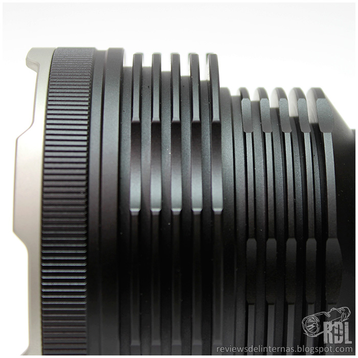 La cabeza de la linterna está en su exterior completamente poblada por aletas disipadoras, talladas de forma que siguen el perfil del reflector y maximizando así la superficie en contacto con el aire en esta crítica zona de intercambio de temperatura.