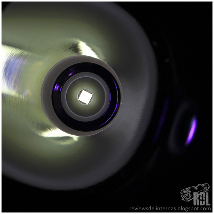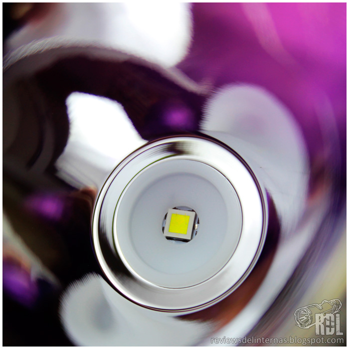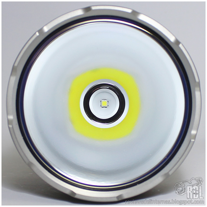 La óptica de la linterna está compuesta por un enorme reflector liso, completamente limpio y libre de imperfecciones. En su centro encontramos un centrador de color blanco, el cual mantiene al XHP35 HI perfectamente enfocado en la parábola. Una lente de cristal ultra claro y con tratamiento antireflejos (con ese clásico halo violeta) y un bisel almenado de acero con acabado mate rematan el asunto.