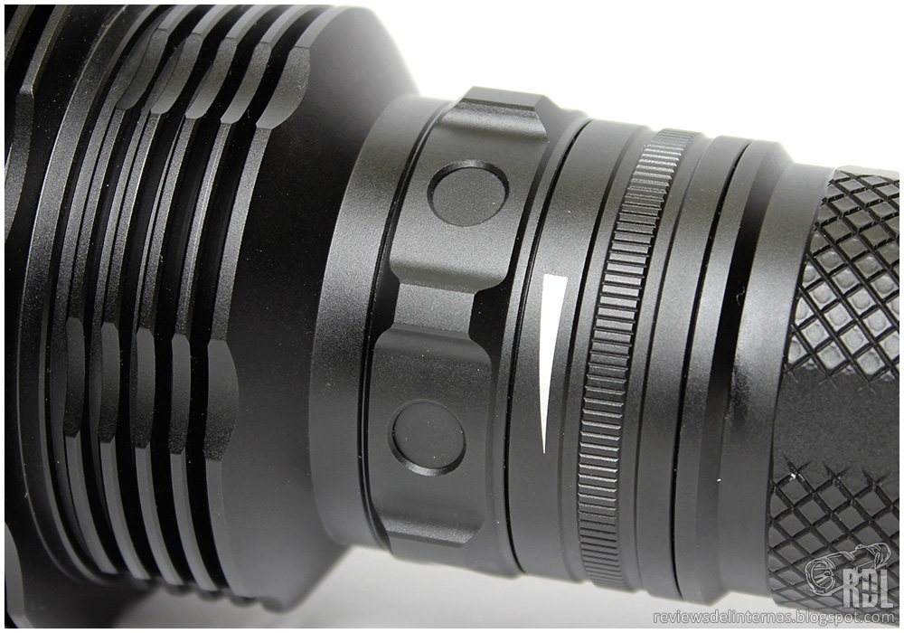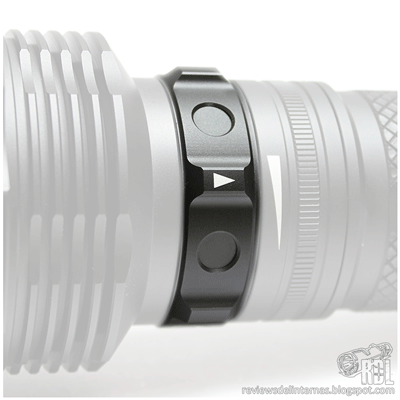 En el cuello tenemos el anillo magnético mediante el cual seleccionaremos la intensidad / modos de la linterna. El mecanizado de este anillo tiene varias zonas que sobresalen del perfil, haciendo el movimiento rotatorio de este muy cómodo incluso con guantes gruesos. Este anillo tiene siete posiciones fijas, mediante retenes, delimitando de manera muy clara cada posición. El tacto del anillo es muy bueno, con cierta resistencia y con una clara señal al tacto de cada uno de los retenes.