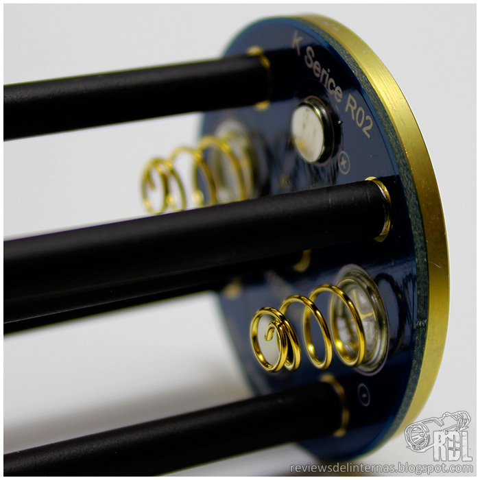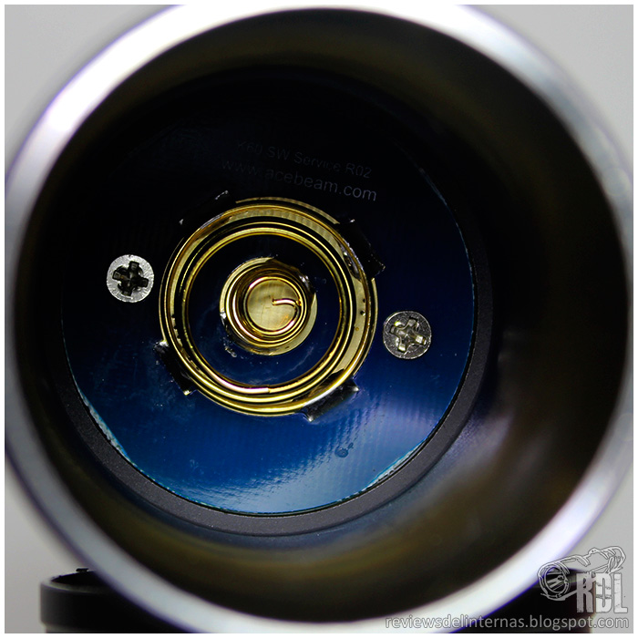 En su interior encontramos el contacto para el portabaterías, realizado mediante un robusto muelle con baño dorado, y un disco metálico que protege el acceso al circuito de la linterna.