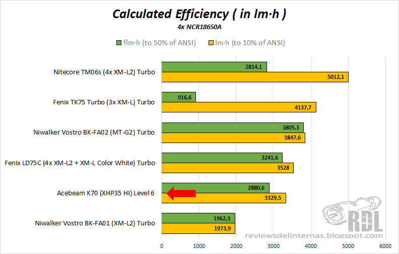 Los 12V necesarios para encender el XHP35 HI juegan en contra de la eficiencia de esta linterna, aunque siendo sinceros me esperaba algo mucho peor, del estilo de la BK-FA01 o incluso peor, pero podéis ver como en el cálculo hasta el 50%, gracias a su regulación en tres fases es capaz de alcanzar una cifra nada despreciable teniendo en cuenta las limitaciones propias del emisor de 12V.