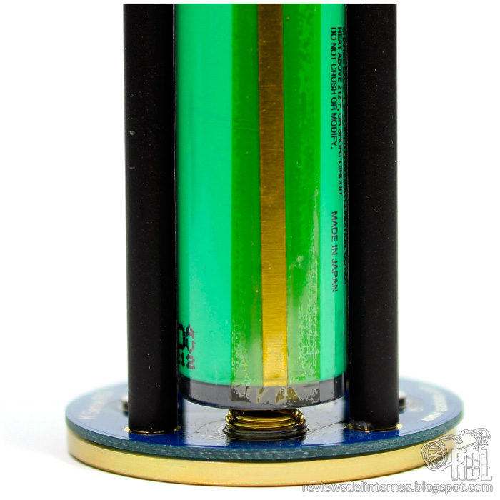 Los contactos para el anodo sobresalen ligeramente, por lo que este portabaterías admite baterías flat y button top. La longitud es relativamente generosa, pudiendo alojar sin contratiempos una batería protegida de 70mm de largo. Una curiosidad de este portabaterías es su distribución, 4S1P, osea, que las cuatro celdas están colocadas en serie, ofreciendo 16.8V cuando las baterías están completamente cargadas. Acebeam, en su manual de instrucciones, aconseja el uso de cuatro baterías no protegidas de alta capacidad de descarga, o en su defecto baterías protegidas con circuitos de triple MOSFET, lo que nos da una idea aproximada de la demanda...