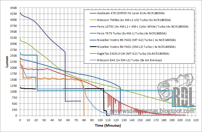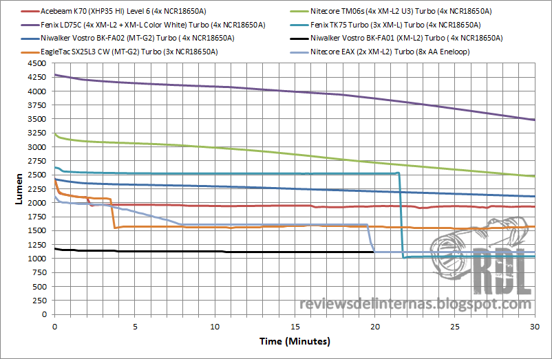 Comparada con otras linternas de altísimo rendimiento, la K70 queda bien encajada dentro del grupo, algo realmente loable por el enorme handicap que su emisor de 12V supone para efectos comparativos con otros emisores como múltiples XM-L2 o el MT-G2 de la BK-FA01. La linterna que más se le parece sería la Niwalker Vostro BK-FA-01, por su número de baterías y emisor único, y como podéis observar el rendimiento de la K70 es muy superior.