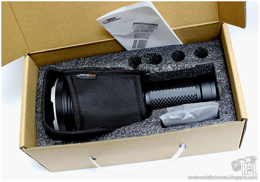 En su interior encontraremos la linterna alojada dentro de un molde de espuma sintética, además de una pequeña funda parcial de material textil, así como una bolsa en la que encontramos un juego de o-rings de recambio, un recubrimiento del pulsador de recambio, correa muñequera, manual de usuario en inglés y tarjeta de garantía.