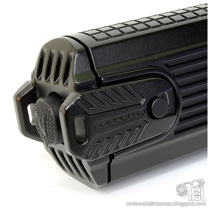 El sistema de cierre del tailcap es bastante novedoso. En lugar de utilizar el clásico sistema de cierre roscado, Nitecore ha implementado un sistema de cierre "a presión", en el que el tailcap se sujeta a la linterna mediante dos abrazaderas situadas a ambos extremos.