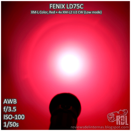 • Luz auxiliar UV y de color: Volvamos al punto de Standby, y en lugar de girar el anillo a derechas, lo hacemos ahora a izquierdas. El primer reten que encontramos pertenece a la luz UV, el siguiente a la luz roja, seguido de la verde y un retén más nos lleva a la luz azul. Esta luz multicolor producida por los LEDs integrados en el reflector ofrece un rendimiento no comparable al del XHP50. Nitecore ha utilizado un LED para cada color, lo que reduce considerablemente los artefactos generados, pero no los elimina por completo.