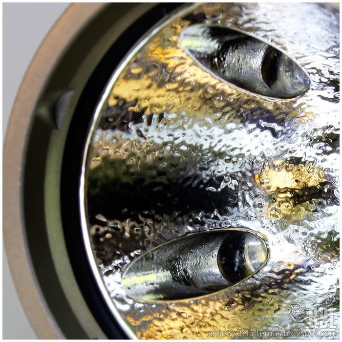 La óptica está compuesta por un bisel de acero liso, lente de cristal con tratamiento anti-reflejos, reflector OP con cuatro orificios situados aproximadamente entre si a 90º para la luz de color auxiliar y en CREE XHP50 perfectamente colocado en el centro.