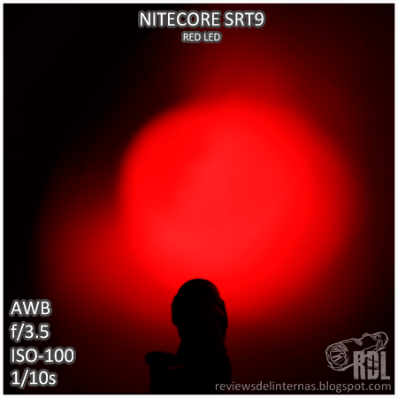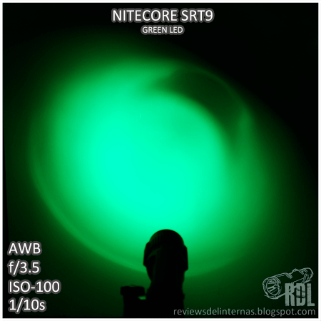 La proyección de la luz auxiliar de color es distinta. Aunque Nitecore ha utilizado un LED para cada una de las aplicaciones (en lugar de LEDs RGB como en la SRT7), la proyección es bastante asimétrica debido a la luz rebotada de forma desigual por el reflector principal del XHP50.