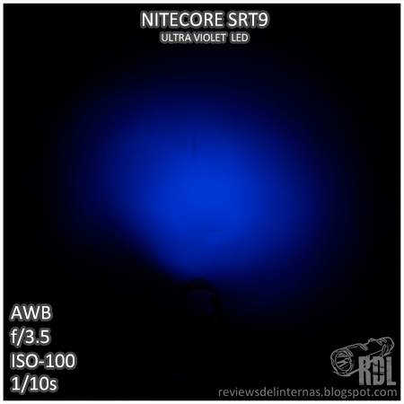 El LED ultravioleta tiene una longitud de onda de 365nm, aunque si la comparamos contra el que se empleó en la Nitecore P20UV veremos que el instalado en la SRT9 genera mucha más luz (violeta) visible.