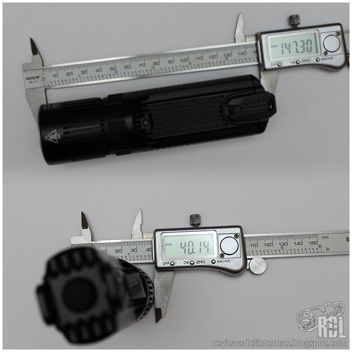 La óptica tiene unas dimensiones identicas a las de muchas otras linternas de la marca, con unos 40mm de diametro, como por ejemplo en la EC4, SRT7GT, P25... La longitud total de la linterna es bastante contenida, algo menos de 150mm.