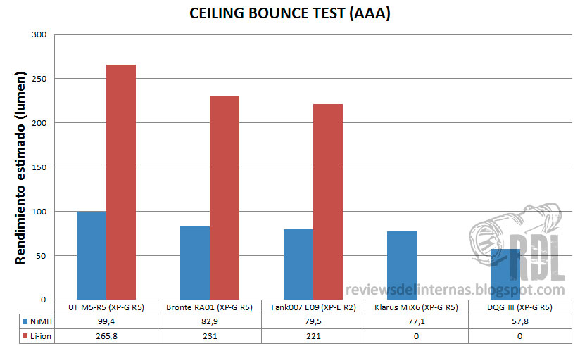 Me llamó la atención la cantidad de luz que esta M5-R5 escupe, especialmente con una simple NiMH en sus entrañas. Tanto que, para salir de dudas he realizado un segundo test, esta vez para comparar su rendimiento lumínico frente a otras. Para este test he usado un luxómetro para recopilar las lecturas de luxes rebotados del techo de una pequeña estancia a los 5 segundos de encenderlas, para luego extrapolarlos a lumen estimados usando una fórmula.