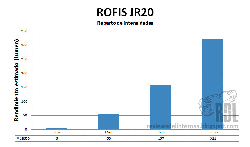 Podemos observar en la gráfica como la linterna está regulada, ofreciendo un rendimiento constante a lo largo de la vida útil de la batería. No hay ningún tipo de stepdown en el modo Turbo. El rendimiento en este Turbo es sencillamente espectacular.
