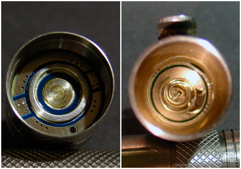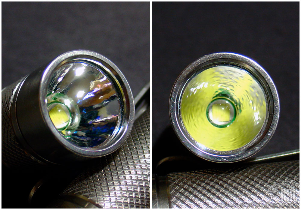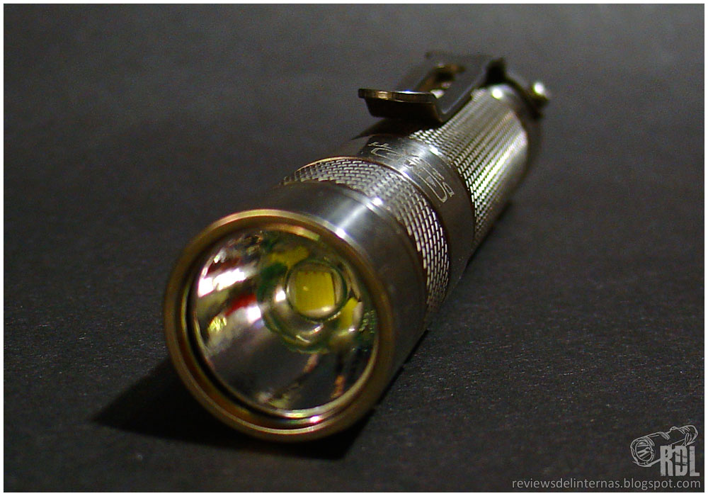 Empezando por la cabeza, la linterna cuenta con un cristal ultra-claro, templado y con tratamiento anti-reflejos. Tras este, un reflector ligeramente rugoso (VLOP very light orange peel) nos enfoca el encapsulado del cree XM-L U2. En el lado opuesto, tenemos el circuito con una protección mecánica contra instalación de baterías con la polaridad inversa.