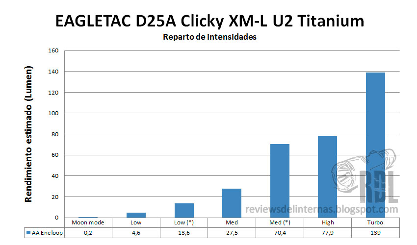 (*)Por último, Eagletac especifica que el uso de baterías Li-Ion 14500 está soportado, a costa de perder los modos y la regulación, y recomienda en su página de especificaciones técnicas no usar más de cinco minutos seguidos la linterna cuando está alimentada por una 14500 para protegerla del sobrecalentamiento.