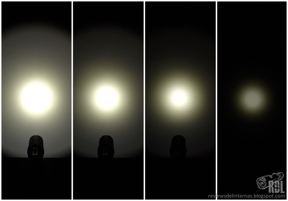 En la secuencia principal tenemos el bajo-medio-alto-turbo, seleccionables mediante pulsación en el interruptor electrónico lateral. Encendemos la linterna con el interruptor trasero e iremos alternando entre las distintas intensidades con sucesivas pulsaciones en el interruptor electrónico lateral.
