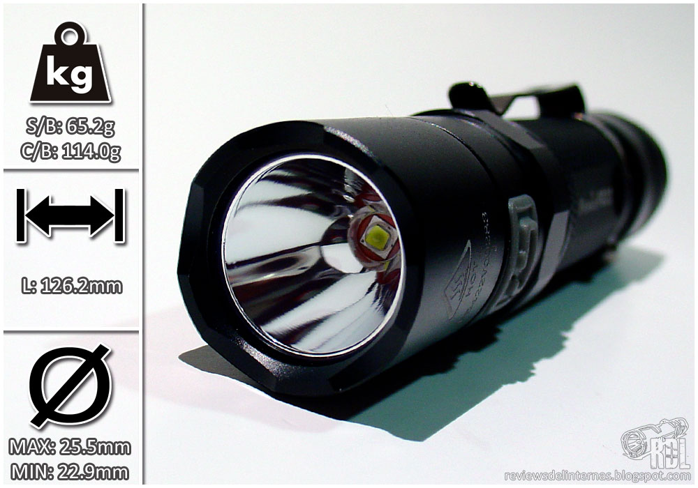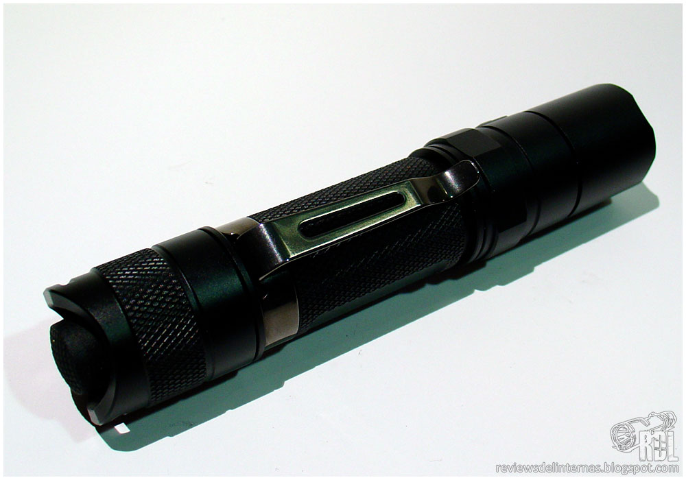 La sección central esta exteriormente recubierta de un knurling muy bueno que la dota de un excelente grip, en el que hay dos planos diametralmente opuestos. Uno de ellos aloja el logotipo y modelo de la linterna grabado a laser.