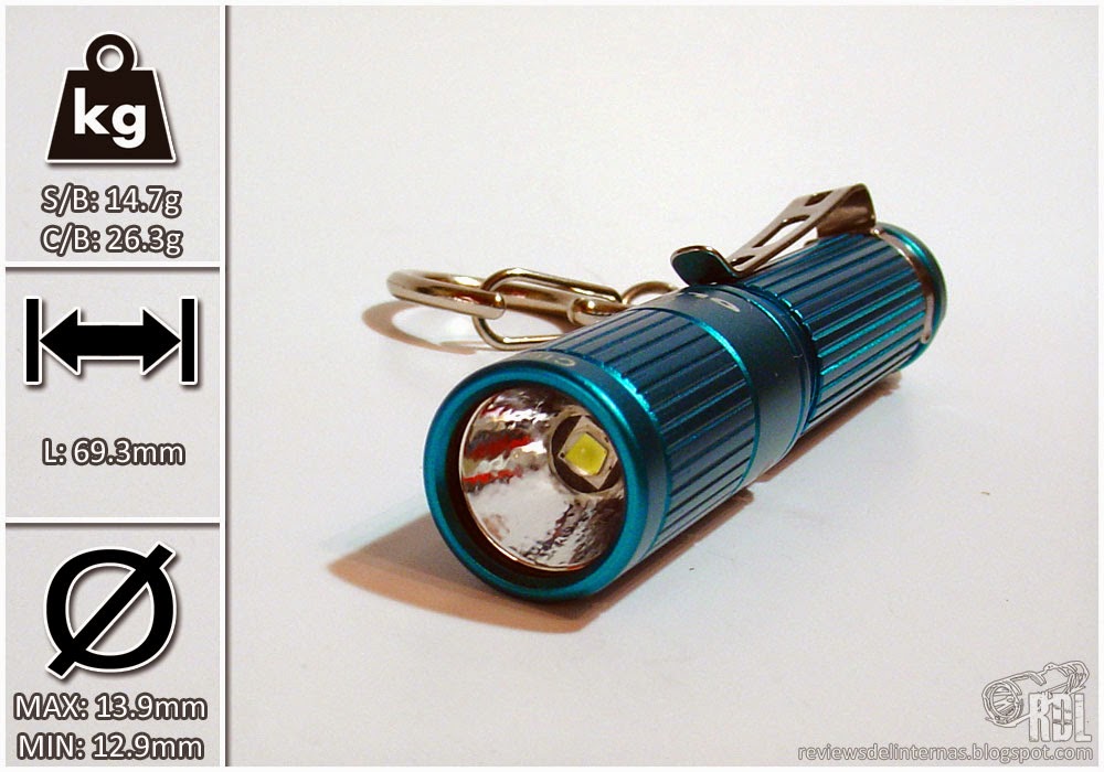 El anodizado de esta unidad tiene un tono azul turquesa muy original, completamente uniforme y sin defectos o distintos tonos apreciables. La gama se completa, además de este azul, con anodizados rojo, negro, lila y anaranjado. Cuenta con varios grabados en su cuerpo, con logotipo de la marca, modelo, LED empleado y número de serie, todos ellos bien definidos y perfectamente legibles.