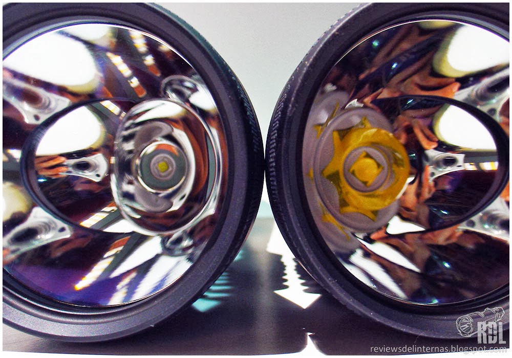 La óptica de las Vostro es impresionante y realmente muy bien acabada. Un enorme e inmaculado reflector liso, de ~90mm de profundidad y 70mm de diámetro, nos enseña en su fondo el emisor, perfectamente centrado en ambos modelos. La lente es de cristal con tratamiento anti-reflejos.