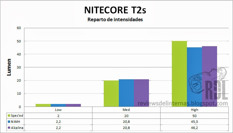 Como podéis observar, las intensidades de esta T2s son bastante cometidas. Con una salida declarada por el fabricante de 50LM. Tras comprobar y contrastar los valores declarados por Nitecore con los obtenidos en la esfera integradora, podemos decir que hay una buena consistencia entre ellos.