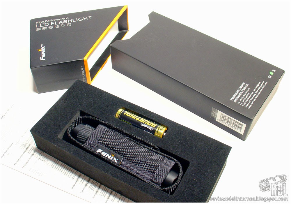 En el interior de la caja, encontramos la linterna alojada dentro de su funda en el recorte central de la espuma sintética, y a su lado un recorte adicional en el que se incluye una batería AA alcalina. Bajo la pila AA encontramos la documentación junto con la correa muñequera y un par de O-rings de recambio, todo ello dentro de una pequeña bolsita de plástico.