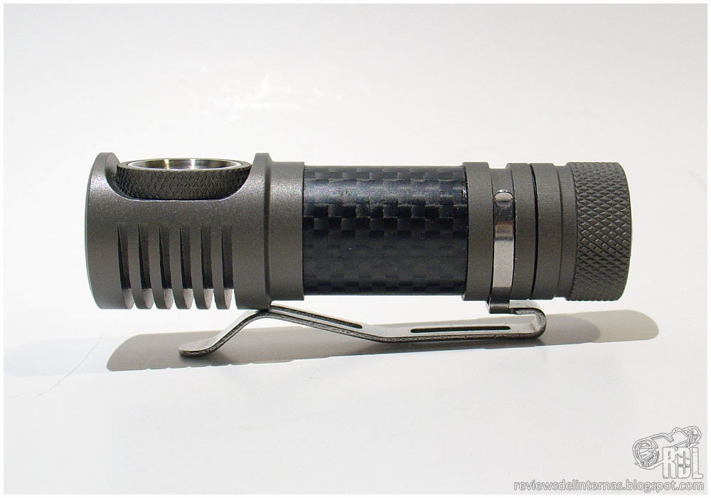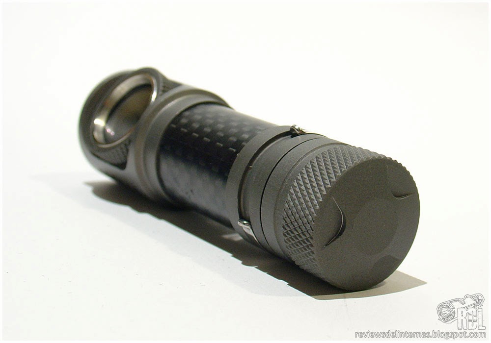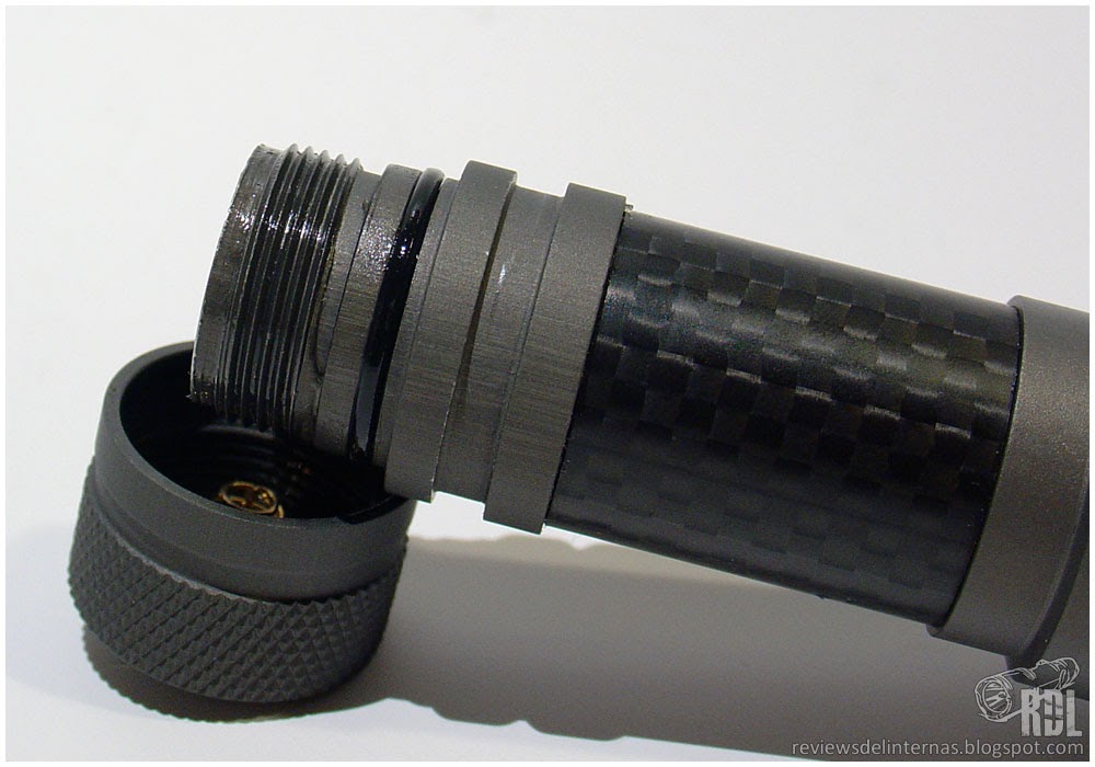 El cuerpo de la linterna cuenta con una camisa de fibra de carbono. Este añadido es simplemente un detalle estético, ya que no se me ocurre ningún tipo de característica funcional que este material pueda aportar a la linterna que no lo haga el aluminio. Aun así, he de reconocer que este tipo de compuesto, para alguien como yo a quien le gusta y sigue la F1 desde hace muchos años, tiene un encanto especial.
