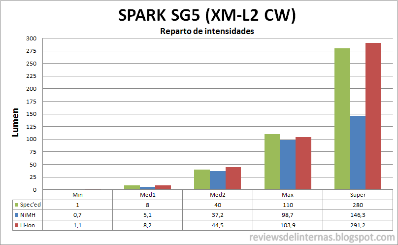En general, la SG5 está muy por delante en lo que a regulación y eficiencia se refiere si la comparamos con su homologa "low cost". El desfasado XR-E Q5 que emplea la Ultrafire, sumado a la conservadora corriente que el LED recibe a consecuencia del deficitario diseño de disipación no puede competir con el XM-L2 de última generación generosamente disipado con el que SPARK ha dotado a la familia SG.