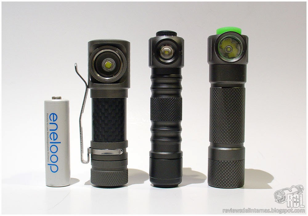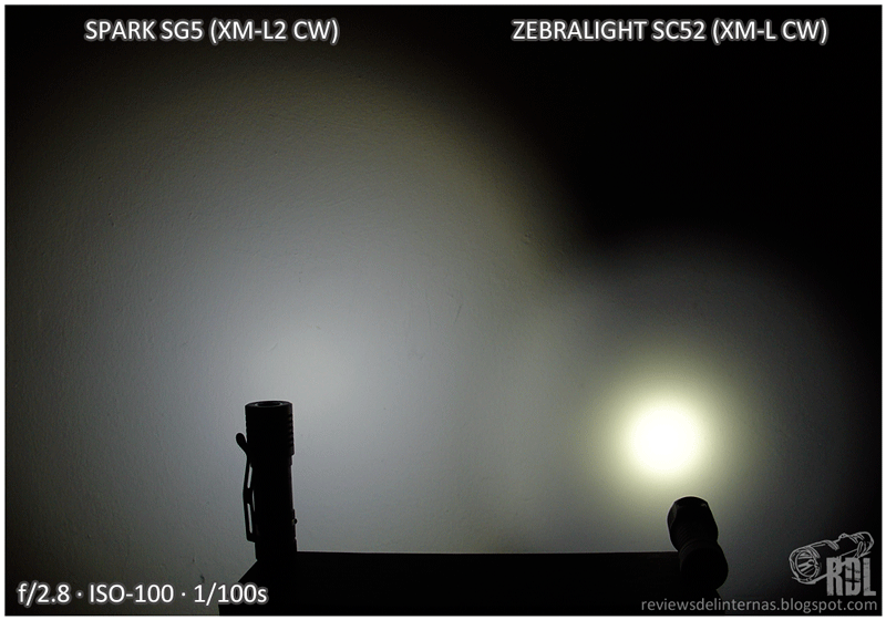 Aquí podéis ver la diferencia entre el área iluminada por esta SG5 frente a otra linterna AA, en este caso una Zebralight SC52, que utiliza reflector para colimar la luz emitida: