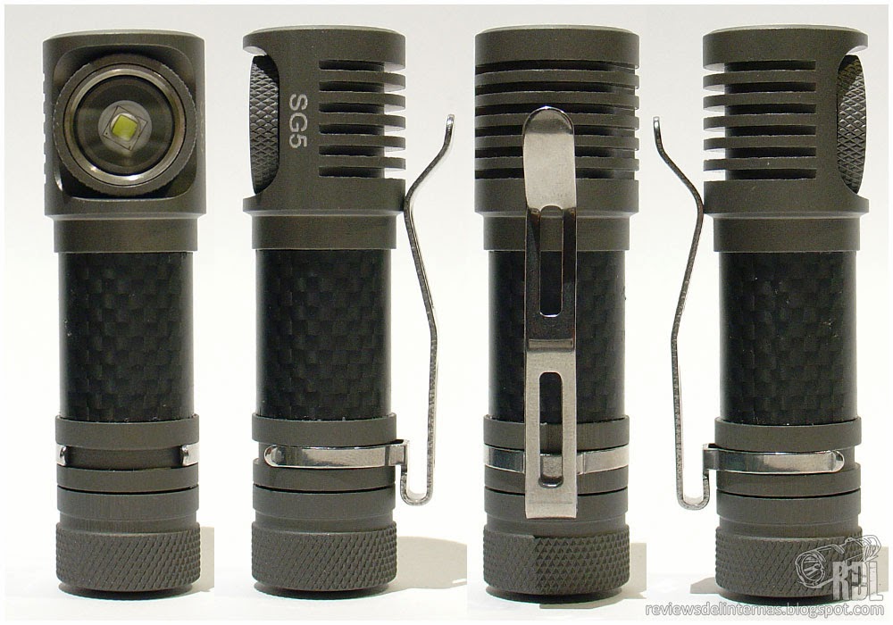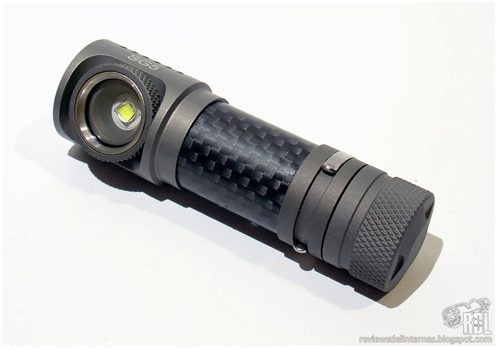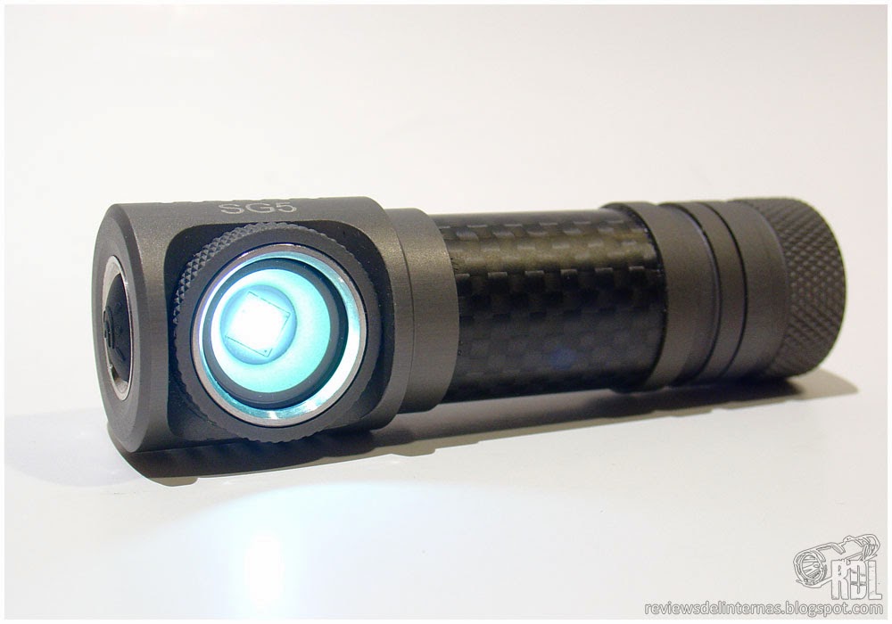 Aspectos positivos: He quedado muy satisfecho con la SG5, tanto por su rendimiento como con su acabado. El toque cosmético de la fibra de carbono le da ese puntito estético y tecnológico que tanto nos gusta a los que seguimos de cerca el “gran circo” de la F1. El diseño simple de su interfaz de usuario es todo un acierto ya que no precisa de un periodo de aprendidaje como si ocurre con linternas similares (especialmente Zebralight) y aun sin haber leído una palabra sobre cómo funciona cualquiera puede acceder a todas las funciones de forma natural. La proyección es ideal para utilizarla como frontal ya que, a cambio de sacrificar el alcance que otras linternas ofrecen con sus reflectores o lentes colimadoras, la SG5 nos ofrecerá luz abundante y de manera uniforme en nuestras manos y pies, cosa importante a la hora de realizar cualquier tarea de mantenimiento usándola con su banda elástica como frontal o a la hora de caminar a oscuras sin tener que estar a cada momento orientando la linterna para ver donde pisamos. La compatibilidad con baterías de distintas químicas es todo un acierto. El diseño del clip nos permite colgar la linterna encendida por ejemplo de un bolsillo y tener las dos manos libres para cualquier tarea, sin necesidad de cargar siempre con la banda elástica para la cabeza. Los modos son muy equilibrados, con un bajo realmente bajo y unos escalones muy útiles teniendo en cuenta el uso para el que está diseñada. En general, la SG5 es una digna sucesora de mi maltratada H2b, con un rendimiento mejorado, una mayor eficiencia, una infinitamente mejor construcción y un bonito y atractivo diseño.