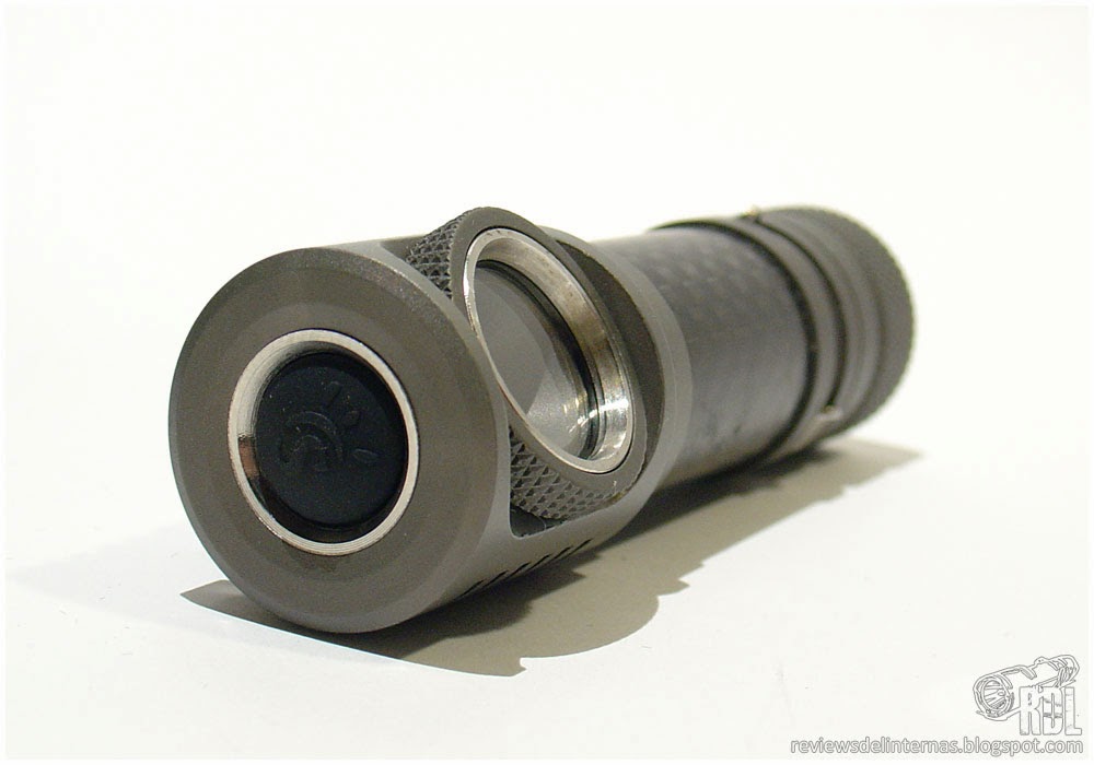 El mecanizado es sencillo pero efectivo, y cuenta con una cabeza algo sobredimiensionada con múltiples aletas disipadoras en el reverso de la óptica. El interruptor es un pulsador electrónico situado en el plano superior de la linterna, rodeado por un marco de acero brillante.