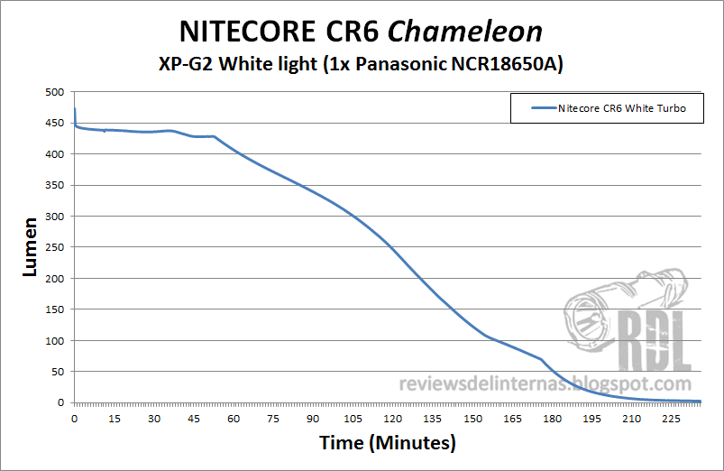 En general, la CR6 muestra una buena eficiencia en los modos máximos de sus dos LEDs primarios, con un buen compromiso entre potencia lineal y runtime.