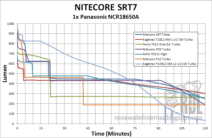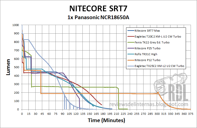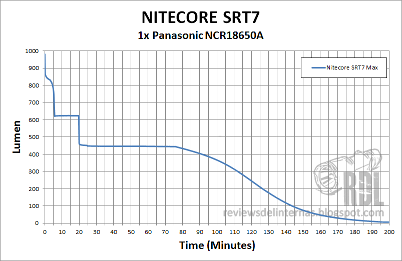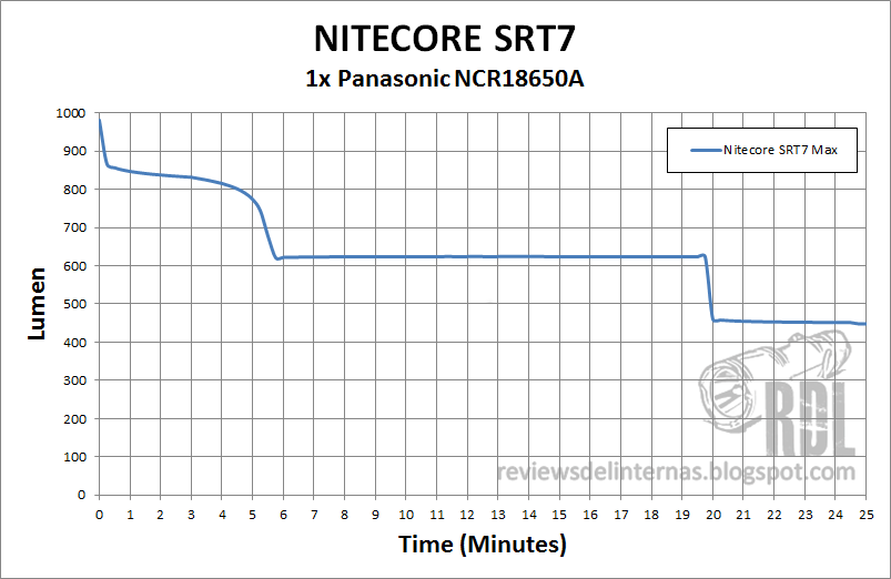 La SRT7 ofrece un rendimiento bastante similar al que ya vimos en la P25, aunque algo más potente gracias al LED de nueva generación empleado. Algo que aunque a priori no pueda parecer muy llamativo, pero que si nos paramos a comprar con las típicas curvas obtenidas por linternas que utilizan anillos magnéticos está bastante por encima, con una regulación en diferentes fases incluyendo dos stepdowns controlados por tiempo.