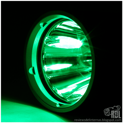 - Luz auxiliar de color: Volvamos al punto de Standby, y en lugar de girar el anillo a derechas, lo hacemos ahora a izquierdas. El primer reten que encontramos pertenece a la luz roja, el siguiente a la luz verde y un retén más nos lleva a la luz azul. Esta luz multicolor producida por los LEDs integrados en el reflector ofrece un rendimiento no comparable al del XM-L2.