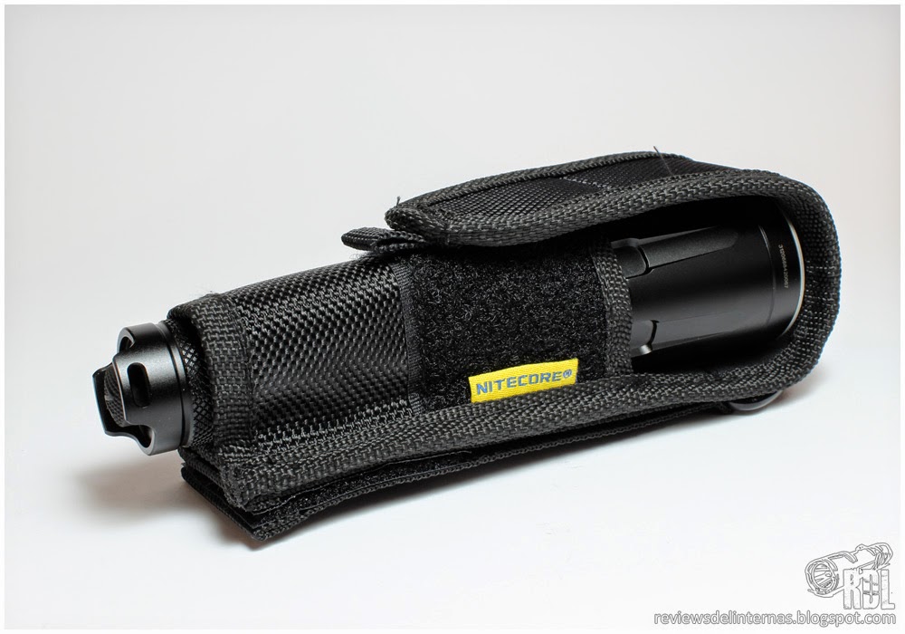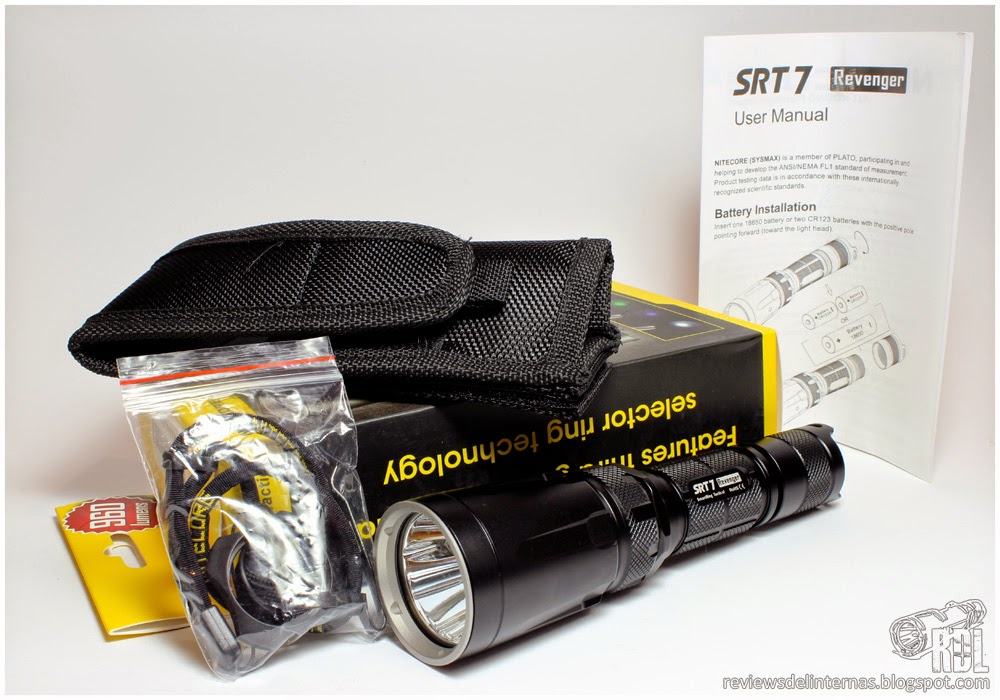 La Nitecore SRT7 llega en una caja de cartón siguiendo las características de otros modelos de la marca. En su interior encontramos además de la linterna un juego de juntas de recambio, un recubrimiento del pulsador de recambio, un anillo táctico de plástico rígido, un clip, correa muñequera de paracord, manual de instrucciones y tarjeta de garantía. Se incluye también una funda con cierre de velcro.