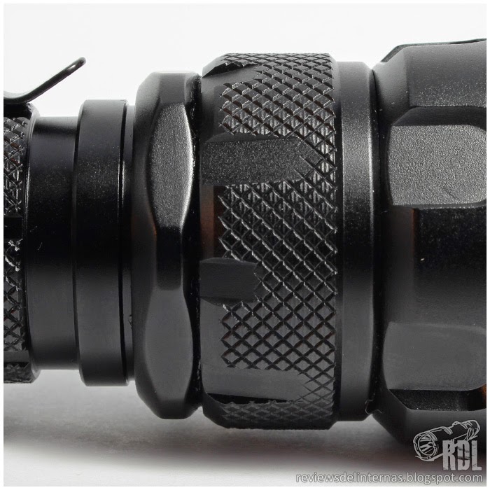 Otro rasgo de su acabado exterior es su dominante knurling, no demasiado agresivo, pero que sumado a las distintas formas del cuerpo hacen que la SRT7 tenga un agarre en mano bueno. Además si instalamos el anillo táctico obtendremos un extra en grip y a la vez evitaremos que la linterna ruede.