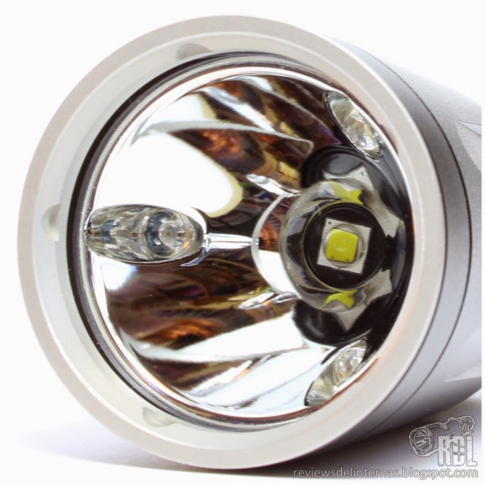 La óptica de la SRT7 es similar a la de la P25, con el mismo bisel de acero plano y ultracompacto aprisionando una lente de cristal con tratamiento antirreflejos. El reflector tiene una novedad, y es que integra tres pequeños LEDs en orificios equidistantes, que están instalados bastante profundos evitando así que la luz del XM-L2, que encontramos centrado mediante un mecanismo plástico, los alcance y creando sombras o aberraciones.