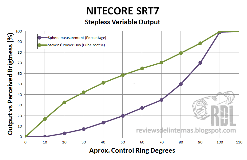 En lugar de la típica gráfica de barras mostrando el rendimiento de cada modo, he preparado está en la que he medido el rendimiento de la zona de ajuste variable por grados de inclinación del anillo. Inspirado por la review de selfbuilt, me he animado a hacer mi propia interpretación de la curva de potencia de la SRT7. El recorrido del anillo en su zona de ajuste variable es de aproximadamente 110 grados. He medido en la esfera el incremento en la salida de luz en intervalos de 10 grados, convertido a porcentaje y luego plasmado en la gráfica, de modo que podéis observar cómo es la curva de LUMEN/GRADOS. Esa es la curva que el sensor de la esfera integradora ve, pero no se parece mucho a lo que yo visualmente percibo al girar el anillo… Como bien puntualiza SB, esta curva no se corresponde con la realidad apreciada por la visión humana, ya que nuestra percepción de la luminancia no es lineal. En otros hilos se ha hablado de este fenómeno, especialmente discutiendo sobre los saltos entre los modos de distintas linternas. Según la Stevens' power law, nuestra percepción de la luminancia es similar a si aplicamos una raíz cúbica al incremento real.
