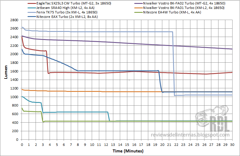 Como era de esperar, el modo Turbo de esta EAX tiene un stepdown controlado por tiempo, que reduce su salida bajando al modo Alto a los tres minutos de uso continuo. Al contrario de lo visto en la EA4, el stepdown se realiza de forma progresiva durante los 5 siguientes minutos, por lo que no notaremos un cambio apreciable en la luminosidad de la linterna. Tras los tres primeros minutos iniciales y los 5 minutos siguientes de progresiva bajada, la EAX estabiliza su salida en alrededor de los 1600LM, donde permanece linealmente regulada hasta los 20 minutos de su encendido, momento en el que baja al modo Alto, con sus 1200LM y permaneciendo otra vez linealmente regulada hasta alcanzar los 80 minutos, punto en el que las baterías son incapaces de suministrar el suficiente voltaje, perdiendo la regulación y entrando en una última fase de caída libre tipo “direct drive”, exprimiendo al máximo las 8 baterías AA.