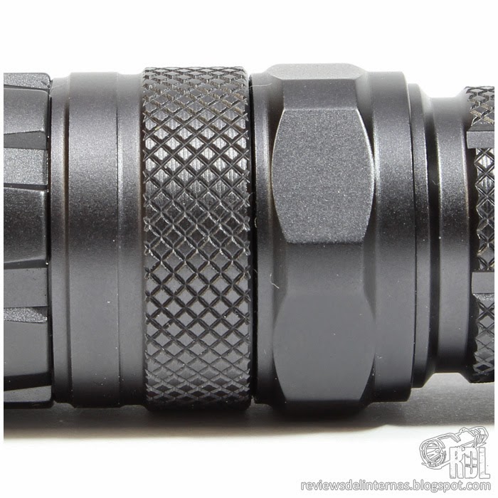 Bajo el anillo encontramos una zona de la cabeza hexagonada, que actúa como mecanismo anti-roll, evitando que la linterna ruede sobre si misma de forma eficaz.