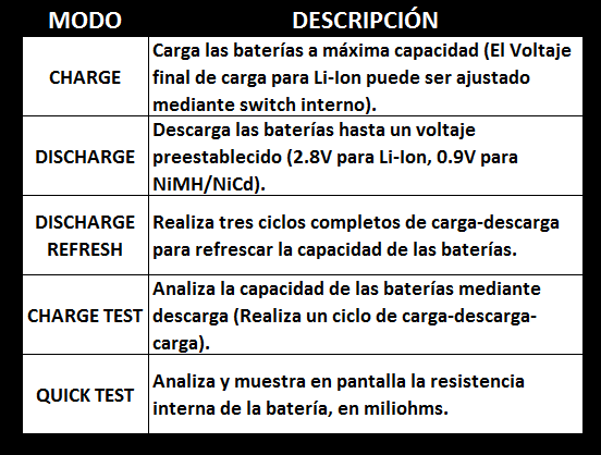 • CARGA (CHARGE): Recarga las baterías hasta su voltaje máximo. Reconoce el tipo de batería automáticamente. Para NiMH/NiCd, una vez completada la carga le aplica una corriente de mantenimiento (trickle charge, alrededor de 10mA). Para las Li-Ion, el cargador detiene por completo la corriente al alcanzar le voltaje máximo, aunque el manual de instrucciones hace referencia a que el cargador detecta una caída por debajo de los 4.0V reanudará la carga. Podemos seleccionar entre 5 corrientes de descarga, 200-300-500-700-1000mA y opcionalmente 1500 y 2000mA en las bahías 1 y 4 si las otras bahías están libres. Durante el proceso de carga podemos revisar el voltaje, el tiempo transcurrido, la corriente actual y los mAh acumulados mediante el uso del botón DISPLAY.