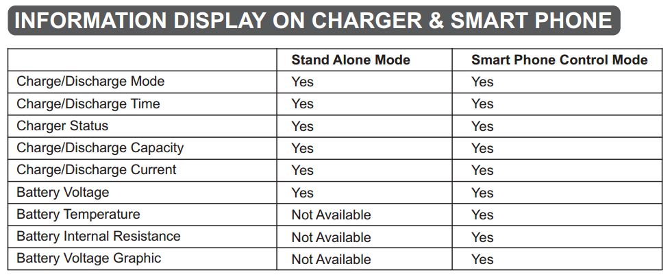 - Detección de baterías dañadas mediante un "test de impedancia" al inicio de la carga, deteniendola si este falla y mostrando FAIL en pantalla.
