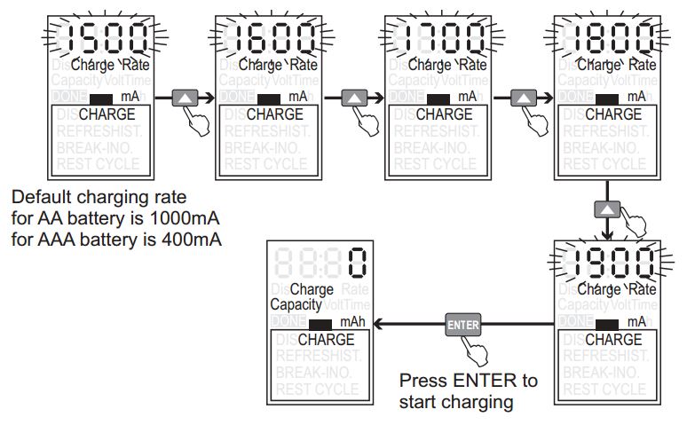 Al insertar una batería en cualquiera de las bahías, el display LCD del cargador nos mostrará la palabra CHARGE parpadeando en el apartado de la bahía que vayamos a utilizar. Podemos cambiar entre las distintas funciones (CHARGE, DISCHARGE, REFRESH, BREAK-IN, CYCLE) utilizando los botones UP & DOWN, y pulsaremos ENTER para aceptar. Dependiendo de la función, el cargador nos solicitará más información para confeccionar el programa a medida, como la corriente de carga, descarga, capacidad, numero de ciclos… Los cuales seleccionaremos por el mismo procedimiento, utilizando los botones UP & DOWN y aceptando con el ENTER.