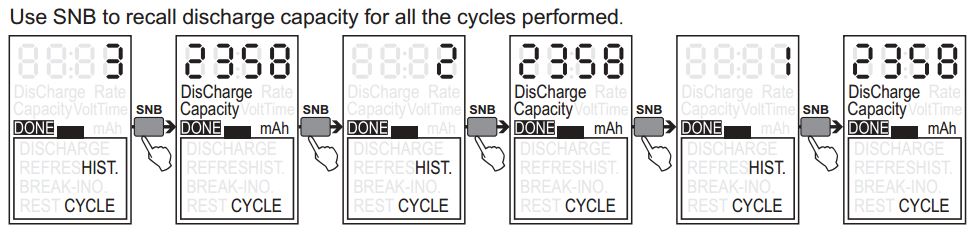 Al seleccionar esta función el cargador nos da a escoger la corriente de carga, corriente de descarga y número de ciclos que deseamos llevar a cabo.